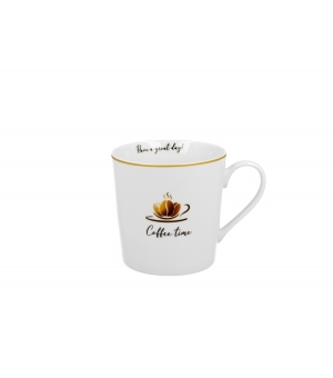 Hrnček s rovným okrajom COFFEE TIME 1 s objemom 360 ml z kolekcie VARIOUS. Tento produkt je vyrobený z porcelánu New Bone China, materiálu známeho svojou vynikajúcou odolnosťou a lesklým, krémovo bielym vzhľadom.