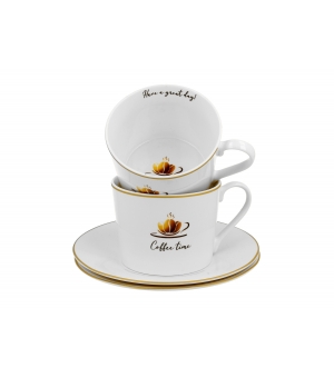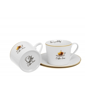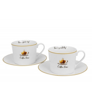 Sada dvoch elegantných šálok s podšálkami COFFEE TIME 1 s objemom 230 ml z kolekcie VARIOUS. Tieto produkty sú vyrobené z porcelánu New Bone China, materiálu známeho svojou vynikajúcou odolnosťou a lesklým, krémovo bielym vzhľadom.