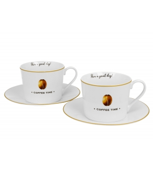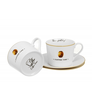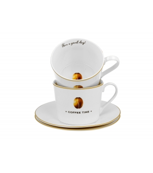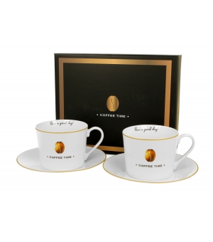 Sada dvoch elegantných šálok s podšálkami COFFEE TIME 2 s objemom 230 ml z kolekcie VARIOUS. Tieto produkty sú vyrobené z porcelánu New Bone China, materiálu známeho svojou vynikajúcou odolnosťou a lesklým, krémovo bielym vzhľadom.