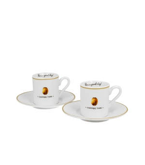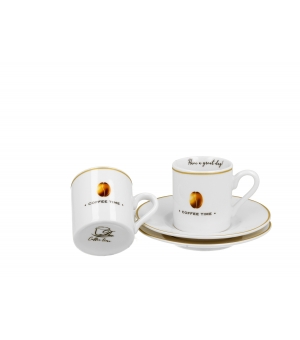 Sada dvoch espressových šálok s podšálkami COFFEE TIME 2 z kolekcie VARIOUS. Tieto produkty sú vyrobené z porcelánu New Bone China, materiálu známeho svojou vynikajúcou odolnosťou a lesklým, krémovo bielym vzhľadom.