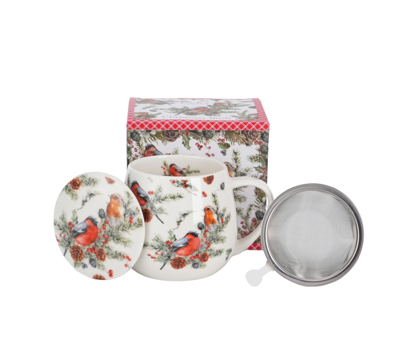 Hrnček CHRISTMAS BIRDS s objemom 430 ml, nálevníkom a viečkom, ktorý je súčasťou vianočnej kolekcie, je vyrobený z porcelánu New Bone China, ktorý sa vyznačuje elegantnou a prírodnou krémovo-bielou farbou s jemným leskom a zároveň výnimočnou odolnosťou.