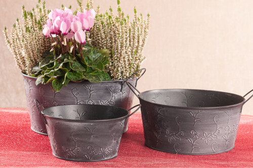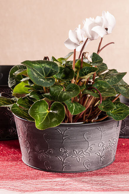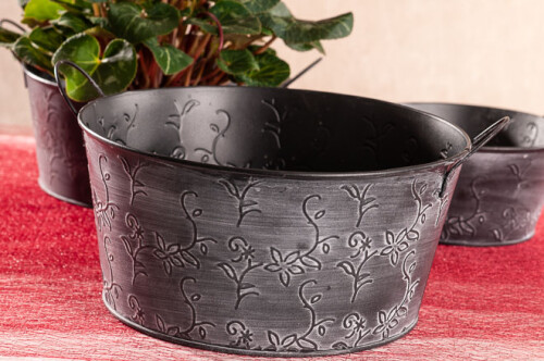 Plechový obal na kvetiny je miskového tvaru. Rastlinu do nej môžeme sadit napriamo. Obal je vysoký 9 cm, široký je 17 cm. Po stranách má dve tenké ušká z drôtu. Obal je čierný, z vonkajšej strany je vyrazený ornament v tvare kytice a finálne je zapracováný do jemnej patiny.