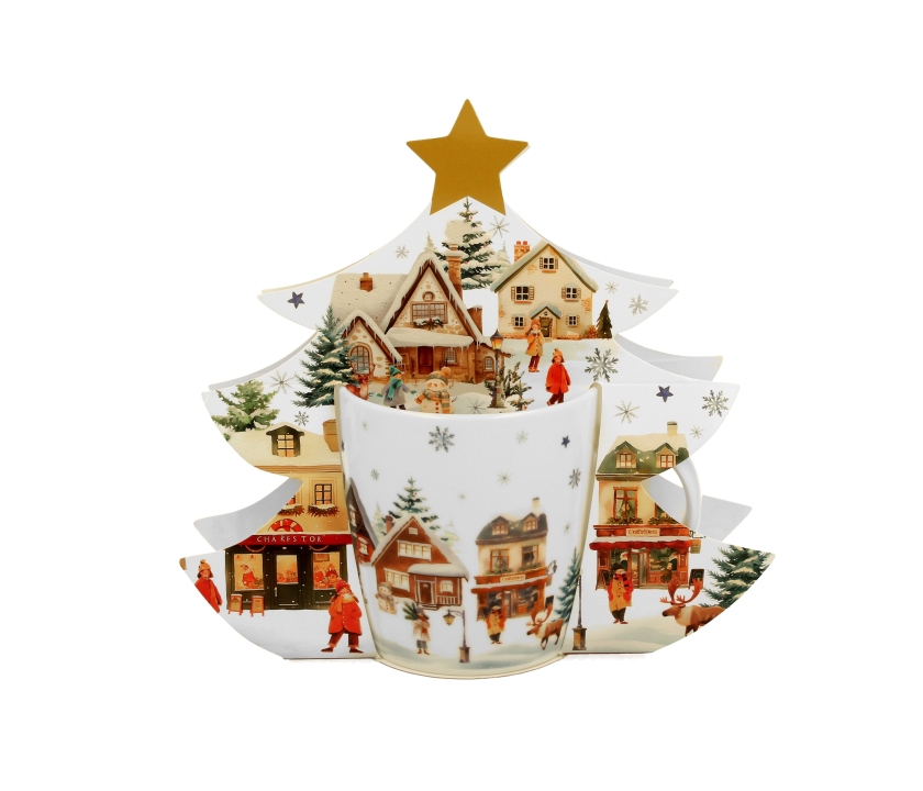 Hrnček CHRISTMAS VILLAGE s motívom vianočného stromčeka s objemom 400 ml, ktorý je súčasťou vianočnej kolekcie, sa vyznačuje prírodnou krémovo bielou farbou s jemným leskom a výnimočnou odolnosťou a dlhou životnosťou, pričom si zachováva ľahký a elegantný pocit.