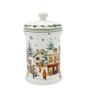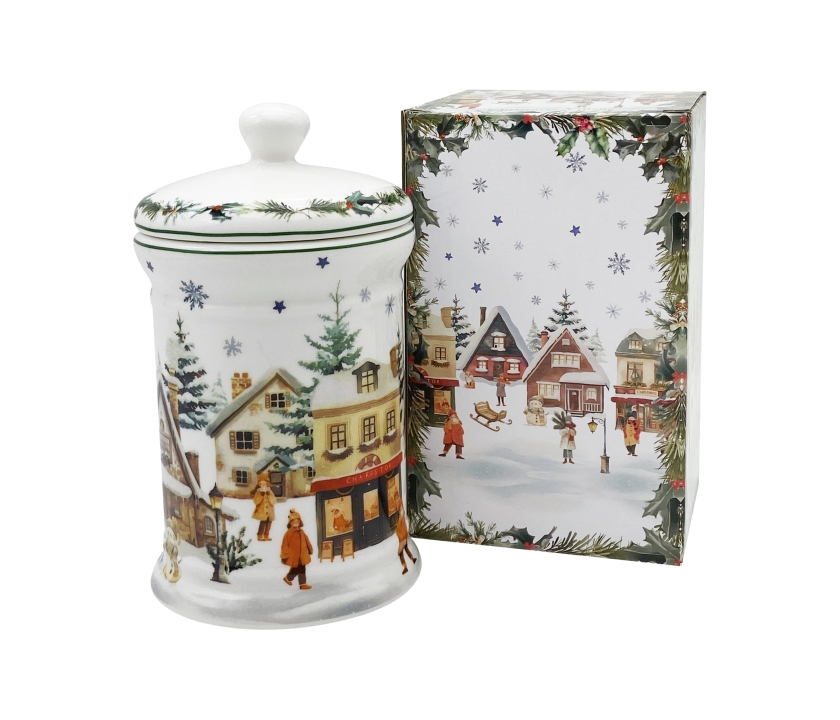 Dóza na sušienky CHRISTMAS VILLAGE, ktorá je súčasťou vianočnej kolekcie, je vyrobená z porcelánu New Bone China, ktorý sa vyznačuje elegantnou a prírodnou krémovo bielou farbou s jemným leskom a zároveň výnimočnou odolnosťou.