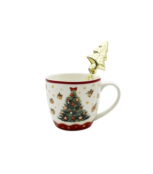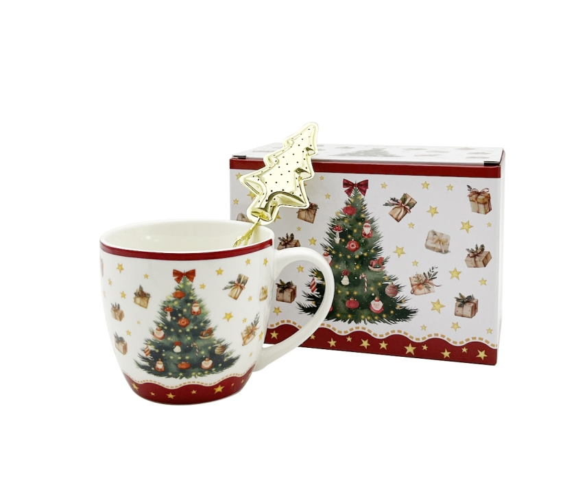 Hrnček CHRISTMAS TREE 3 s objemom 460 ml a kovovým nálevníkom v tvare vianočného stromčeka, ktorý je súčasťou vianočnej kolekcie, sa vyznačuje prírodnou krémovo bielou farbou s jemným leskom a výnimočnou odolnosťou, pričom si zachováva ľahký a elegantný pocit.