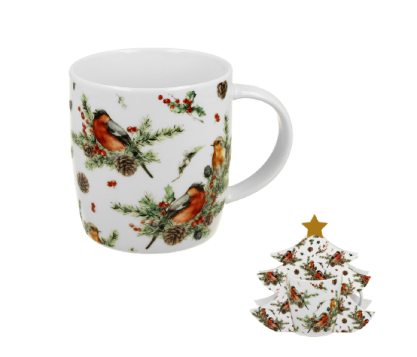Hrnček CHRISTMAS BIRDS 1 s objemom 400 ml v balení v tvare „vianočného stromčeka“, ktorý je súčasťou vianočnej kolekcie, sa vyznačuje prirodzenou krémovo bielou farbou s jemným leskom a výnimočnou trvácnosťou, pričom si zachováva ľahký a elegantný pocit.
