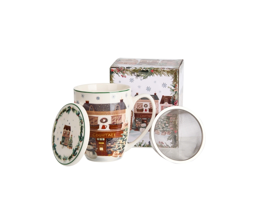 Kolekciu zdobí očarujúci motív maľovaných mestských domov, ktorý vytvára teplú a útulnú atmosféru. Trblietavé hviezdy, snehuliak a krásne ozdobený vianočný stromček vytvárajú jedinečnú a magickú atmosféru. Obklopená jemným rámom z vetvičiek cezmíny, celá kolekcia dodáva prvky typické pre sviatočnú výzdobu.