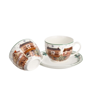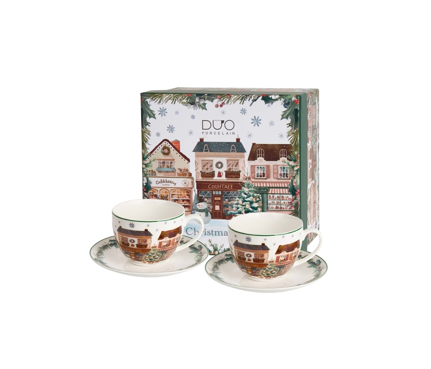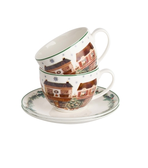 Sada dvoch šálok s podšálkami CHRISTMAS CITY 2, ktorá je súčasťou vianočnej kolekcie, je vyrobená z porcelánu New Bone China, ktorý sa vyznačuje elegantnou a prirodzenou krémovo bielou farbou s jemným leskom a zároveň výnimočnou odolnosťou.