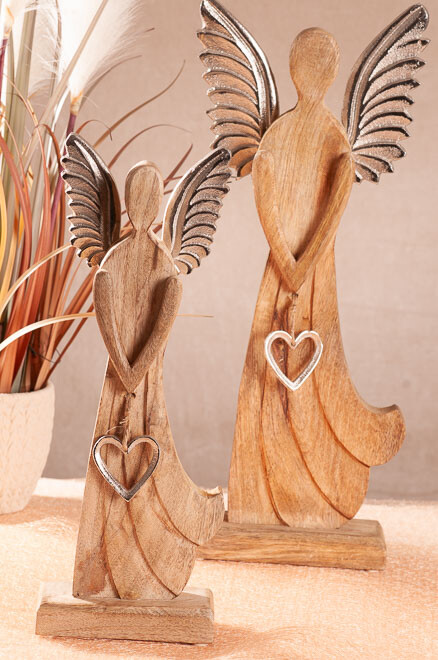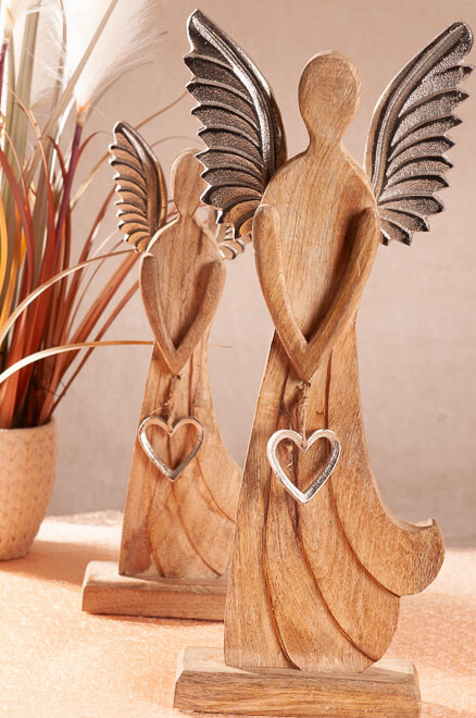 Anjel je vyrobený z exotického dreva, z mangovníka. Anjel je vysoký 36 cm. Má veľké kovové krídla a v ruke drží kovové srdce. Anjel má zaujímavú rozviatu "sukňu". Stojí stabilne na podstavci. Anjel je vyrobený ručne a odchýlky v odtieňoch dreva patria k charakteristickému rysu mangovníka.