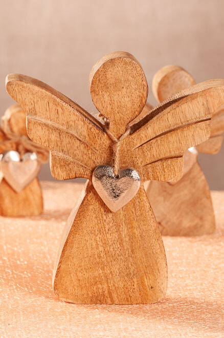 Malý anjelik pre šťastie je vysoký 15 cm. Vyrezaný je z mangovníkového dreva, ktoré vyniká svojou zaujímavou štruktúrou. Anjelika zdobí veľké srdiečko striebornej farby..