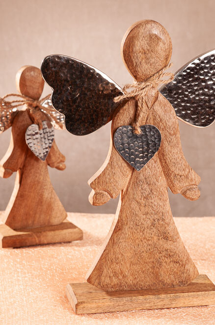 Anjel je vyrobený z mangovníkového dreva. Ako šperk pôsobí srdiečko, ktoré je z rovnakého materiálu ako anjelikove krídelká. Dvadsaťpäť centimetrový anjelik je vyrezaný ručne. Mangové drevo vyniká svojou medovou farbou a výraznou textúrou dreva.
