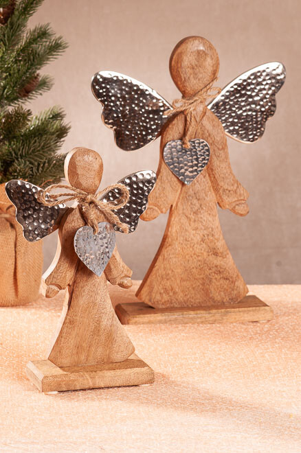 Anjel 34 cm je vyrobený z mangovníkového dreva. Ako šperk pôsobí srdiečko, ktoré je z rovnakého materiálu ako anjelikove krídelká. Dvadsaťpäť centimetrový anjelik je vyrezaný ručne. Mangové drevo vyniká svojou medovou farbou a výraznou textúrou dreva.